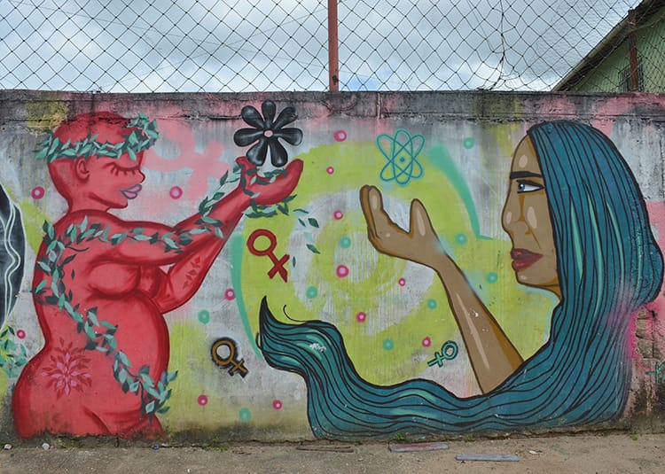 O projeto Artitudes femininas, do coletivo Mulheres arte de rua Pará, coloriu muitos muros de Belém, como o dessa imagem no bairro de Benguí. A organização valoriza grafiteiras da Amazônia, abrindo espaço e promovendo o seu reconhecimento.